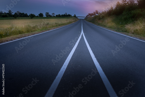 Fototapeta premium Road crossing plains at sunset. Road to far away.