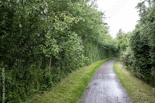 Obraz premium Road for hiking and cycling is wet after rain, passes through the forest.