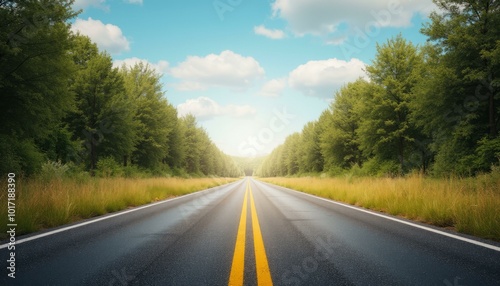 © Anarkali Art, Naklejka premium Road Fork Surrounded by Trees and Tall Grass Under Blue Sky