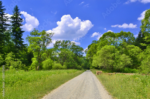 © Jurek Adamski, Naklejka premium Road in a grassy meadow and forest on a blue sky with white clouds