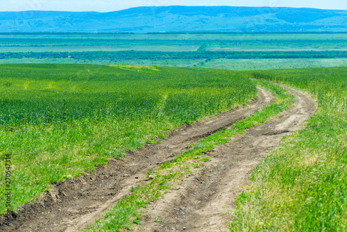© kosmos111, Obraz premium road in a green field, beautiful landscape with mountain views