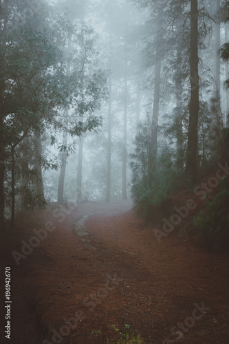 © Igor Tichonow, Naklejka premium Road in a mysterious pine forest. Rainy and misty weather near Cova crater on Santo Antao Island, Cape Verde