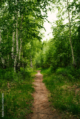 © kseniaso, Fototapeta premium Road in a spring birch grove, path in the woods among birches. Landscape - summer birch forest