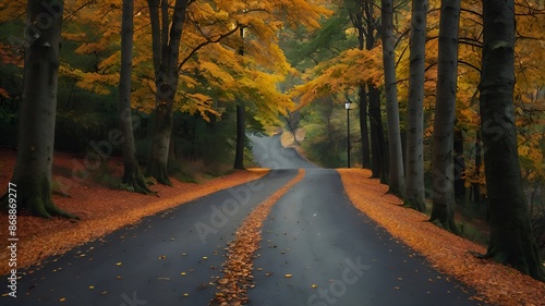 © alimurtaza, Obraz premium Road in autumn. Autumn Landscapes and Foliage. Vibrant fall leaves, scenic drives, parks, nature reserves, harvest scenery.