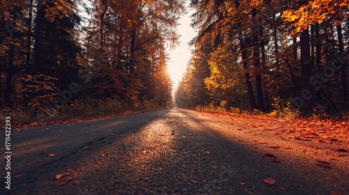 © Julia, Fototapeta premium Road in autumn forest at sunset.