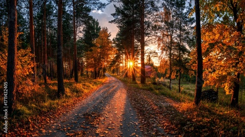 © Julia, Fototapeta premium Road in autumn forest at sunset.