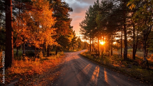 © Julia, Fototapeta premium Road in autumn forest at sunset.