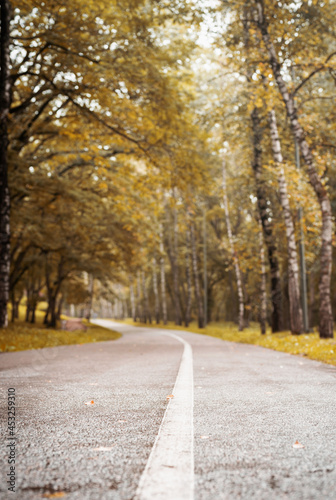 Naklejka premium road in autumn forest, blurred background