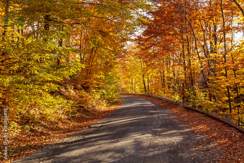 © Arpad Nagy-Bagoly, Obraz premium Road in autumn forest in bright sunlight