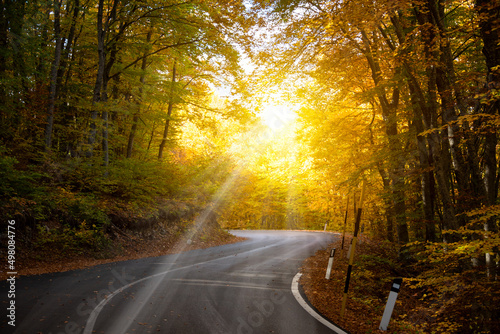 © Maresol, Fototapeta premium Road in autumn forest with colorful trees and plants, seasonal landscape