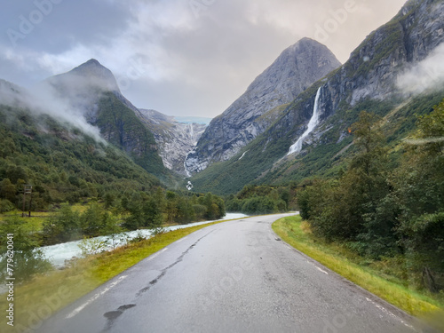© Alberto Gonzalez , Fototapeta premium Road in Briksdal glacier valley in south Norway. Europe