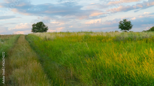 Fototapeta premium Road in green field at sunset.