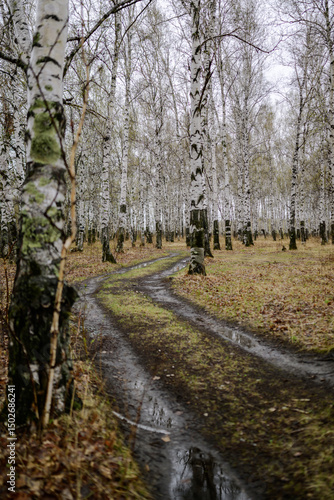 © Алексей Линник, Obraz premium road in the autumn birch forest