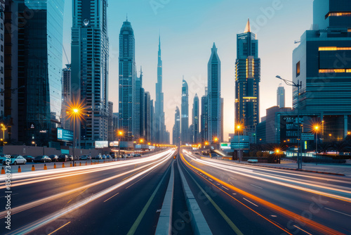 © Ivan, Fototapeta premium road in the city with skyscrapers. Panorama of a big city with lights