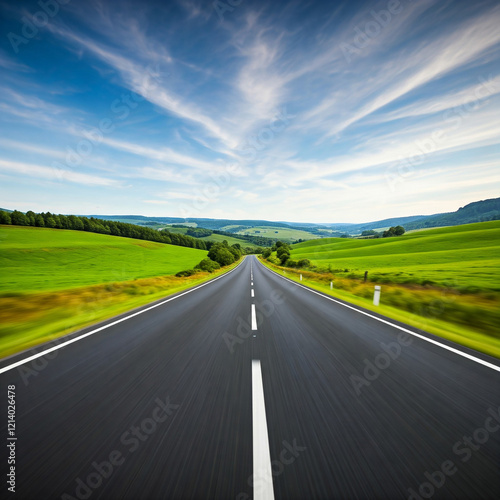 © Sumanta, Fototapeta premium road in the countryside field. Empty road passing through grassy landscape under blue sky.
