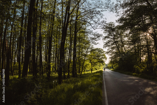 © Jan, Fototapeta premium Road in the forest. Cyclist on the road.