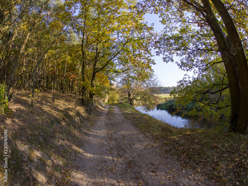 Obraz premium road in woods while spring to autumn transition with beautiful orange and red...