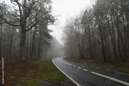 © Kozioł Kamila, Fototapeta premium Road landscape, road between trees in fog in autumn.