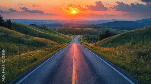 © Alice, Fototapeta premium Road leading through lush green hills at sunset