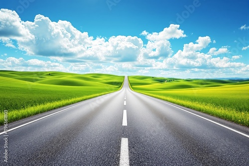 Fototapeta premium Road leading through vibrant green hills under a bright blue sky with fluffy...