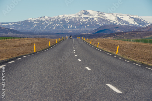 Naklejka premium Road leading to a snowy mountain in Iceland.