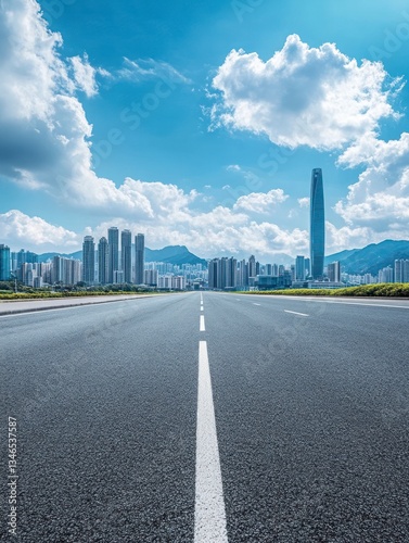 © Niken, Fototapeta premium Road Leading to Modern City Skyline Under a Bright Cloudy Sky