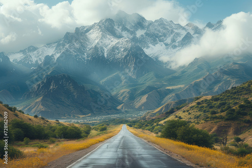 © P, Naklejka premium Road leading to snow-capped mountains through a blooming field.
