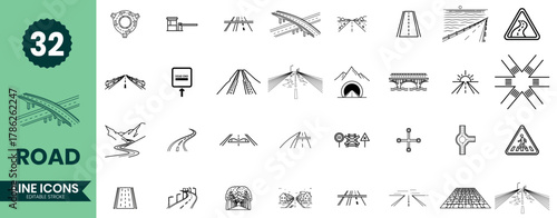 Fototapeta premium Road Line Icons Set 32 Highway, Bridge, Traffic, Infrastructure, and Transportation Outline Symbols