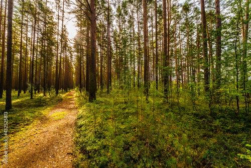 Obraz premium Road lit by the sun goes deep into the pine forest. View from the road