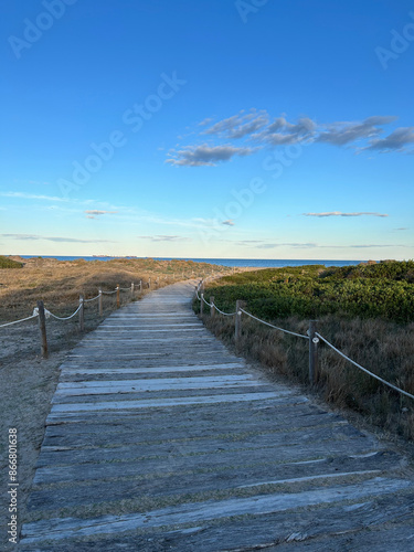 © Iryna, Fototapeta premium road made of wooden planks leading to the sea on a sunny day in Spain, path to the sea
