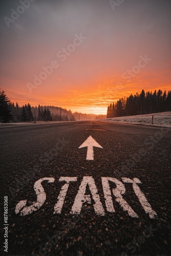Fototapeta premium Road marking with start and arrow at sunset symbol of beginning