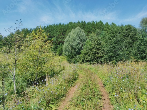 © Sergey Egovkin, Obraz premium road near green forest slope against blue sky on a sunny day