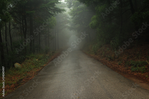 © nvphoto, Fototapeta premium Road Path in a forest covered with mist.