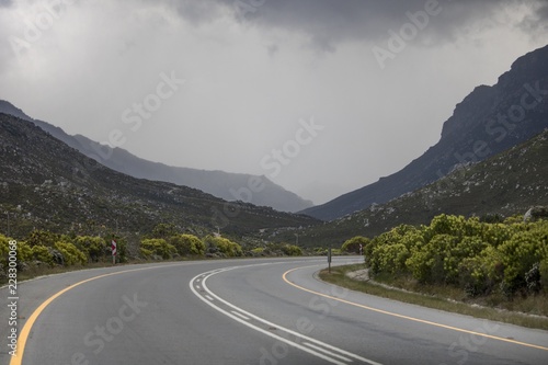 © Global News Art, Naklejka premium Road path through mountain range on Clarence Drive, Kleinmond, Western Cape, South Africa.