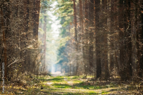 © Great Brut Here, Obraz premium Road Path Walkway Lane Through Spring Coniferous Forest In Sunny Day. Natural Blurred Boke Bokeh Background