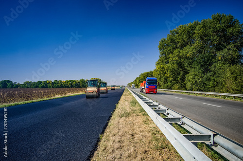 © Andrii, Fototapeta premium Road roller rolls freshly laid asphalt. Road construction.