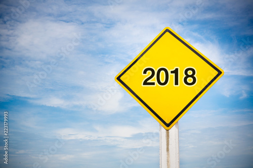 © kanpisut, Naklejka premium Road sign with 2018 on sky background represents the new year 2018.New Year 2018 street sign banner on nature blue sky background.greeting card design template for winter holidays