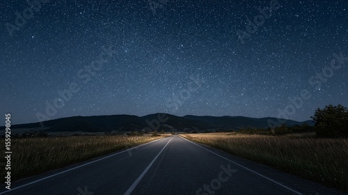 © Alicia, Fototapeta premium Road stretches towards distant hills under a starry night sky.