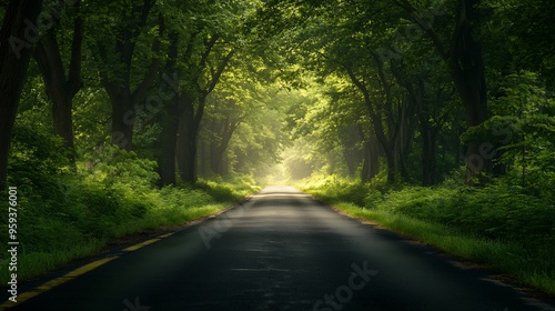 © Generative AI, Obraz premium Road surrounded by green trees : Generative AI