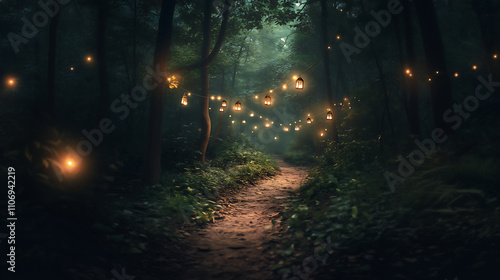 Fototapeta premium Road through a forest and lanterns can be seen