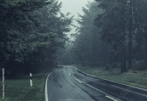 © Ilgov, Naklejka premium Road Through A Forest With Morning Fog. Color Toning