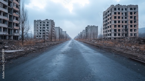 Obraz premium Road through Abandoned Buildings after War