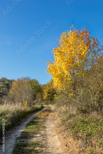 Naklejka premium Road through autumnal countryside with colorful maple tree