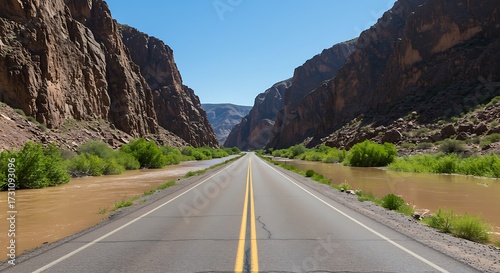 © beo, Fototapeta premium Road through canyon landscape with clear sky perspective view