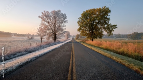 © Serhii, Fototapeta premium Road Through Changing Seasons: Winter on One Side, Summer on the Other