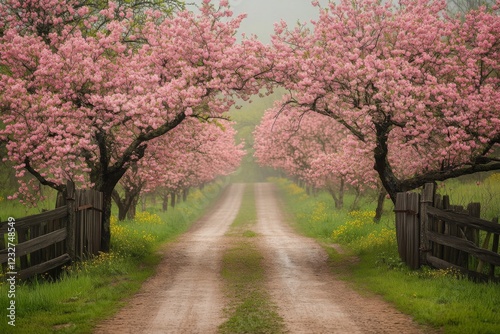 © Andrii Savchuk, Naklejka premium Road through cherry blossom trees in spring