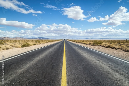 © Imagine Stuff, Naklejka premium Road through desert landscape vanishing towards horizon. Sunny blue sky