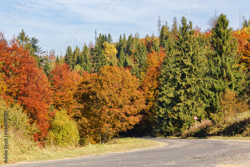 © Pellinni, Fototapeta premium road through forested scenery in autumn. trees in fall colors. mountainous rural area on a sunny day