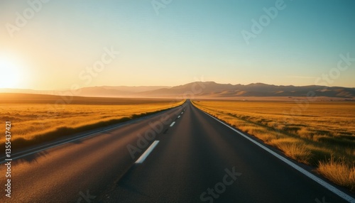© Yudo, Fototapeta premium Road Through Golden Fields at Sunset with Mountains and Clear Sky