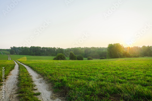 © maxandrew, Fototapeta premium Road through green summer field. Summer landscape.